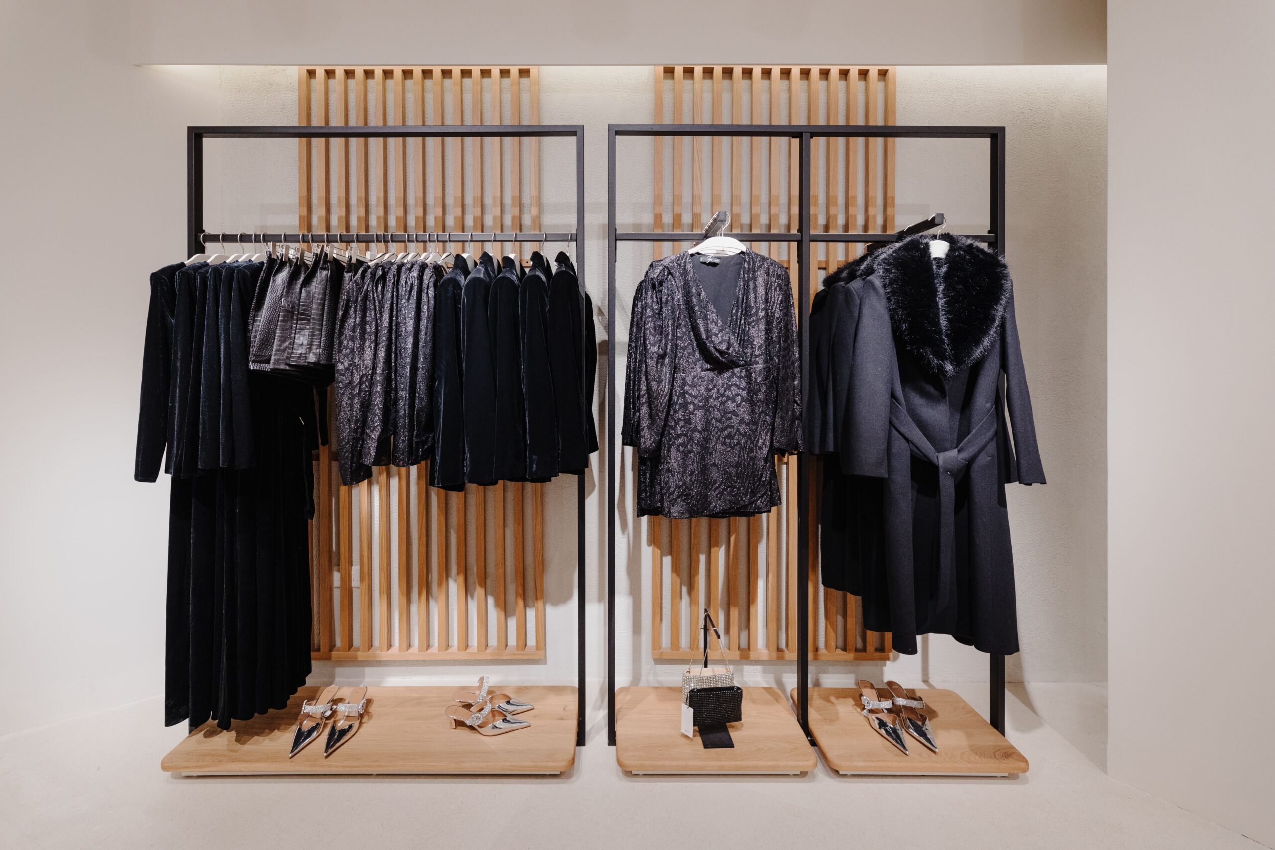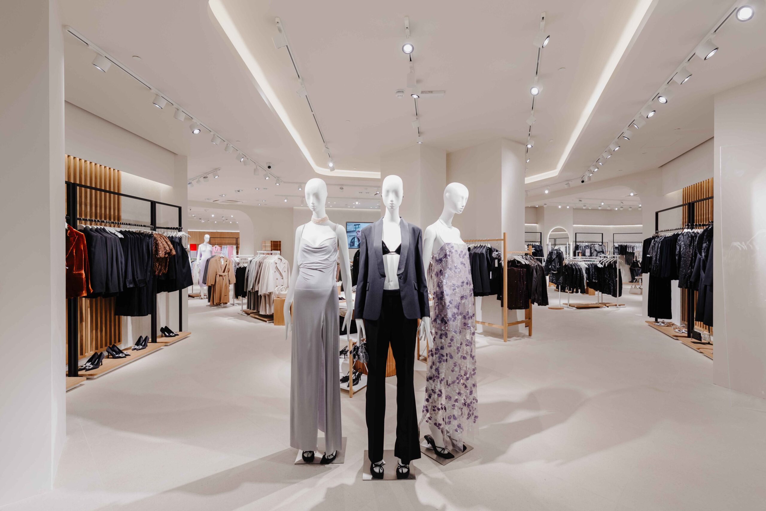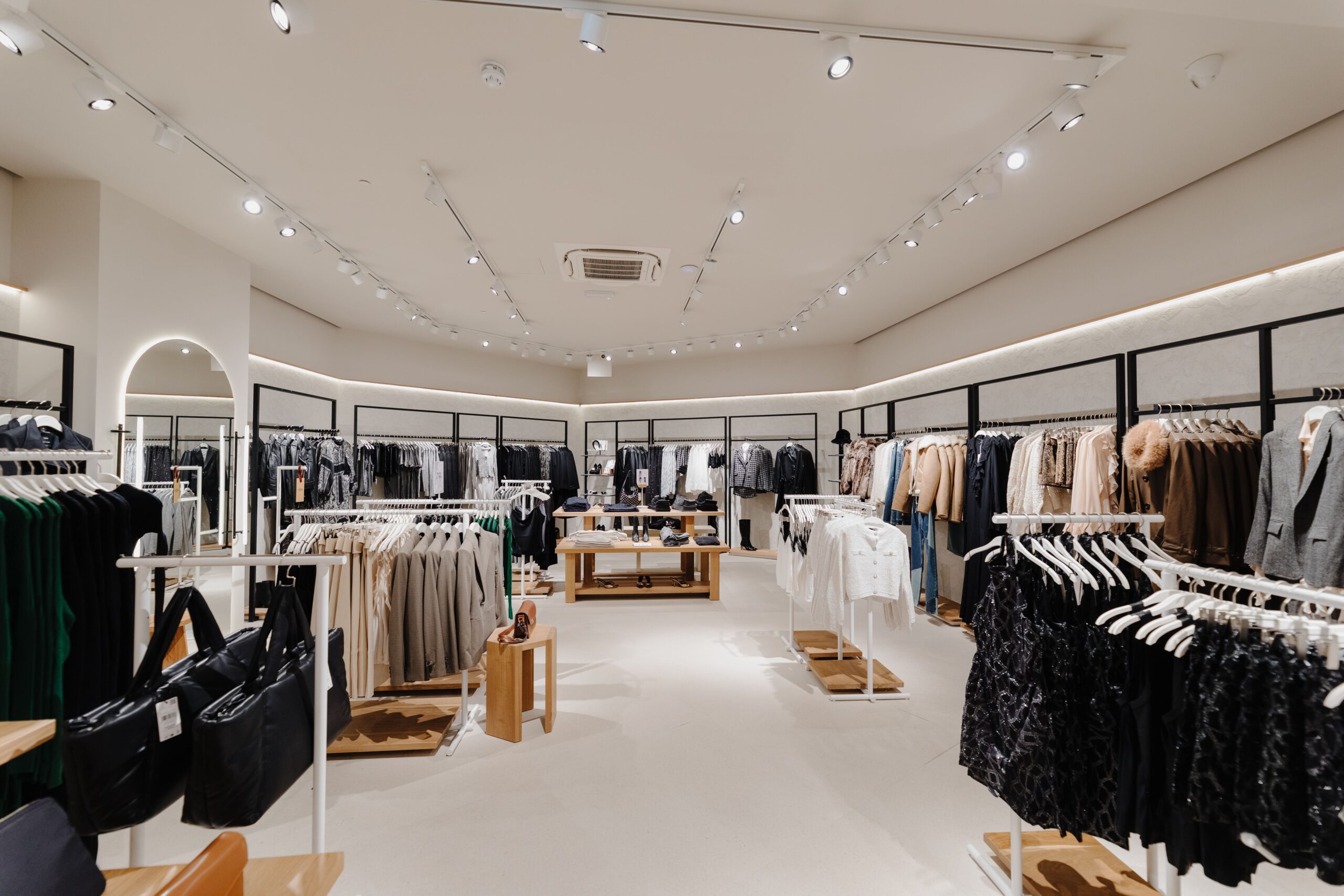 The sense of fluidity and modernity is achieved thanks to the essentiality of the design: oak-effect slatted walls that serve as a support, light stone-effect floors that amplify the space, and the contrasting black ceiling, combined with advanced systems and technologies make the shopping experience unique.