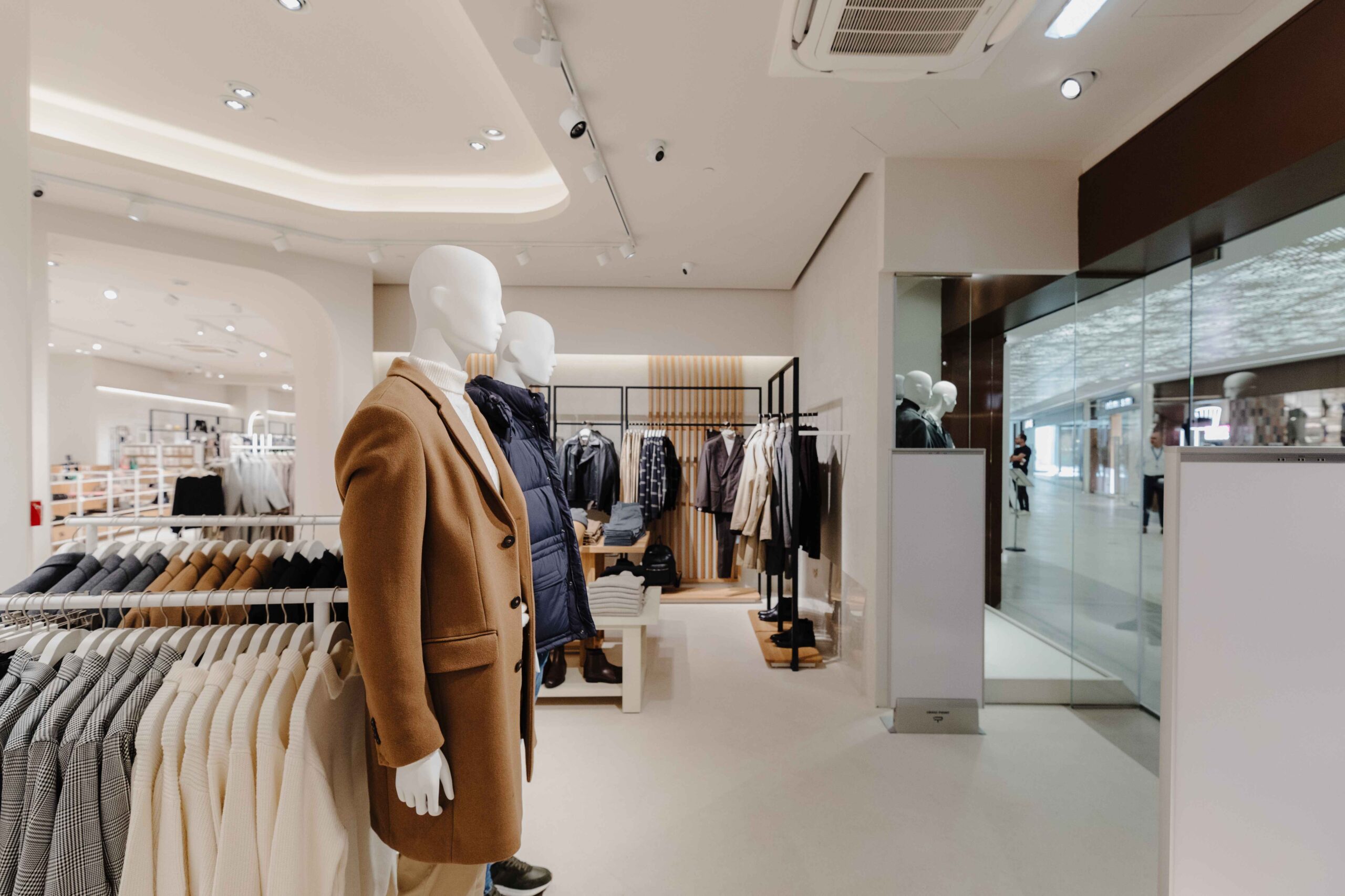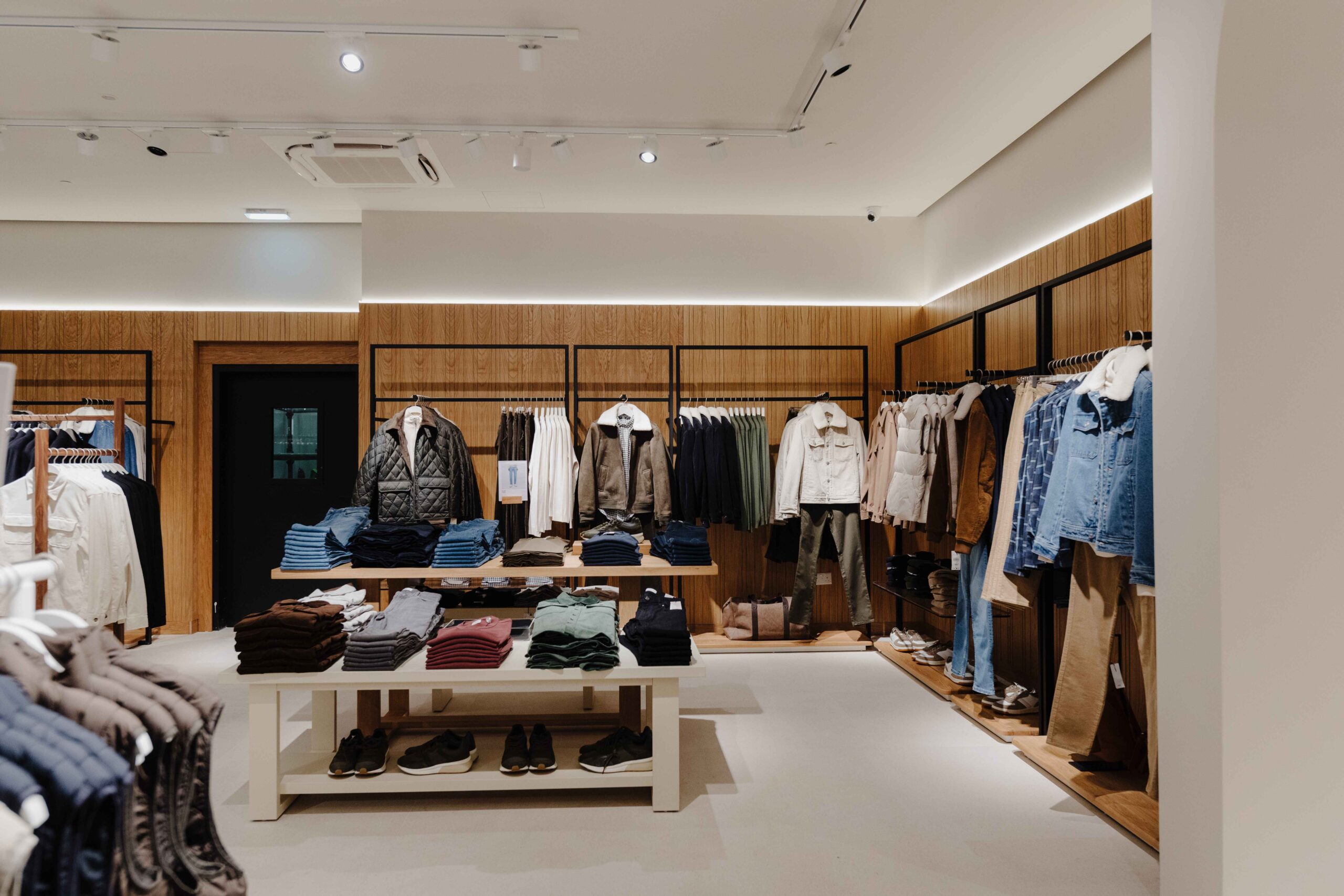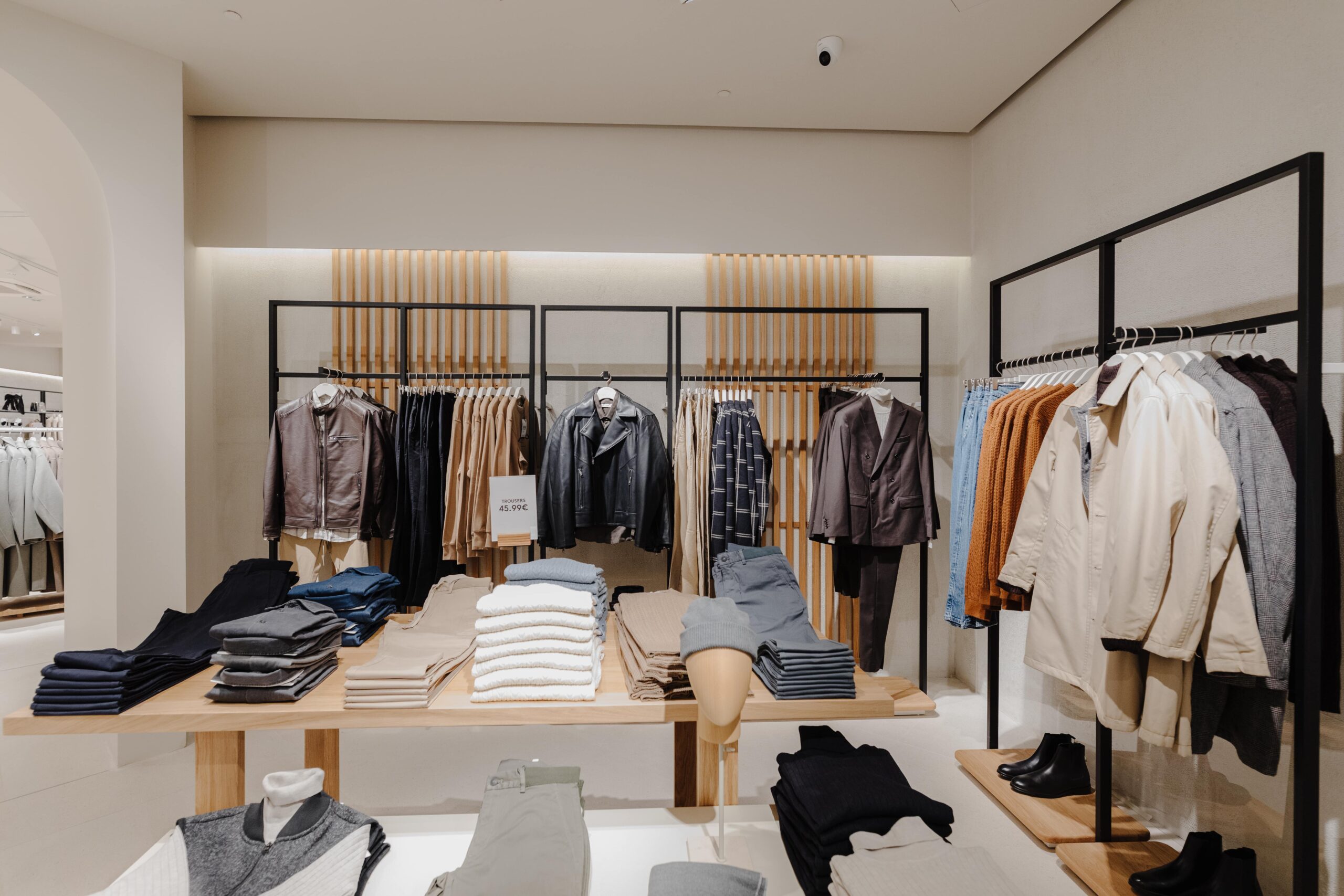 The sense of fluidity and modernity is achieved thanks to the essentiality of the design: oak-effect slatted walls that serve as a support, light stone-effect floors that amplify the space, and the contrasting black ceiling, combined with advanced systems and technologies make the shopping experience unique.