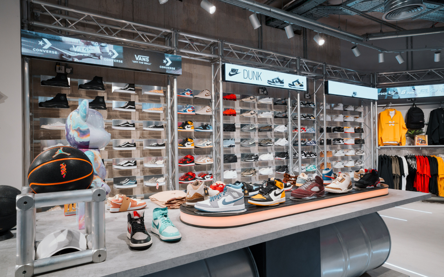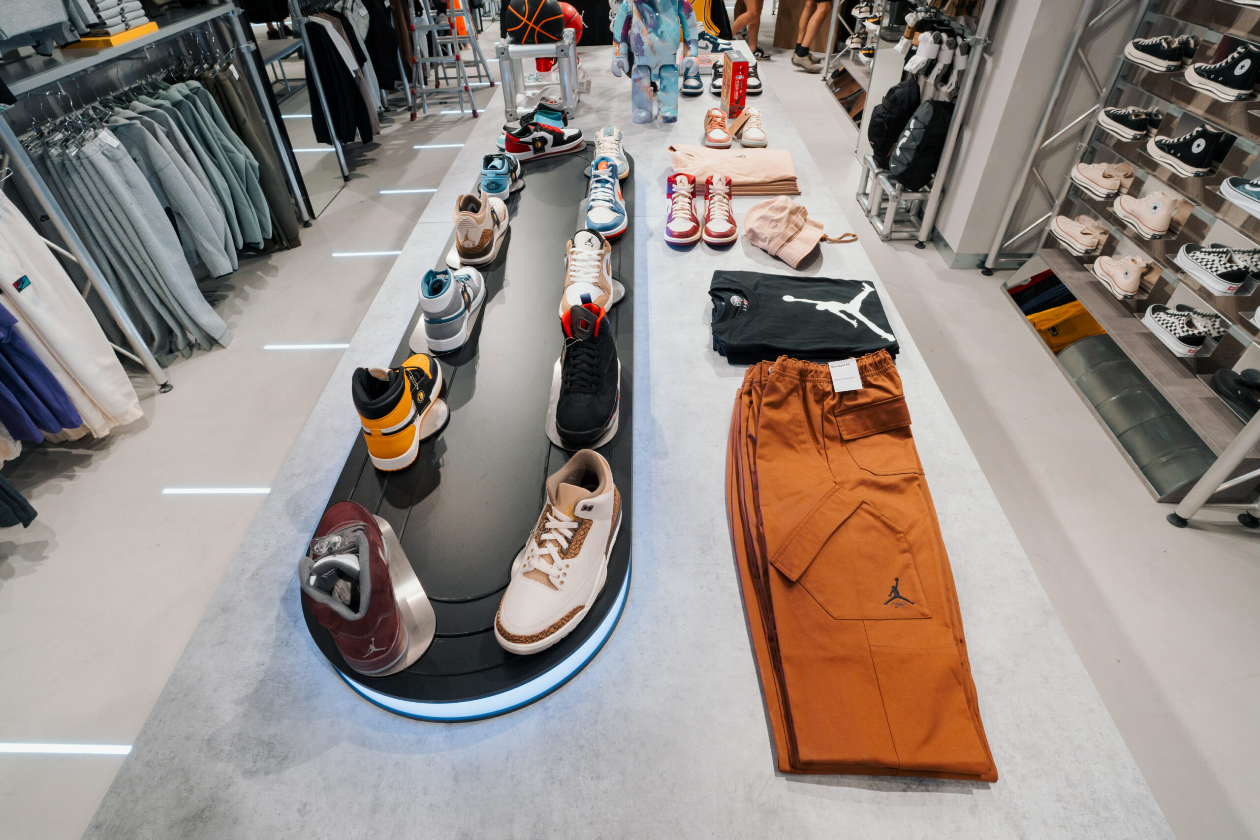 Among its revolutionary features are the introduction of a product and sneaker conveyor belt, strategically designed to captivate customers’ attention and exhibit the latest, exclusive footwear.